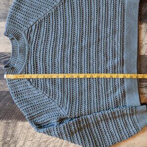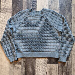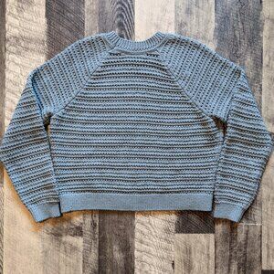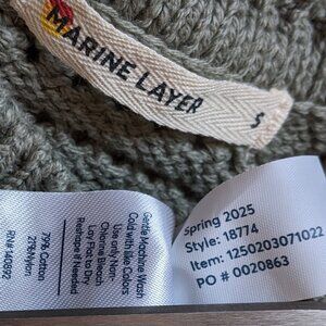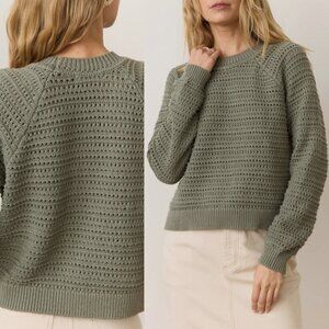 This is a Marine Layer Montecito Crewneck Sweater in Moss green. It is in excellent condition. It is a size small, and the last three images show measurements. Midweight enough to keep you cozy but airy enough to never feel stuffy--perfect for layering or wearing solo as the seasons shift. Knit from soft cotton nylon blend yarns with breezy open stitches. Pullover style, long raglan sleeves, relaxed fit.
