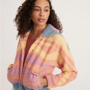 Vibrant high-pile fleece jacket for your everyday. Plush polyester fleece is ultra-soft and cozy. Elastic cuffs and hem help hold in warmth. Side pockets warm hands and stash essentials. Size XL. Excellent used condition- I bought this from Marine Layer myself and only wore it twice.
