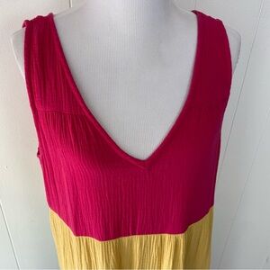 The Marine Layer Rainbow Colorblock Corinne Maxi Dress is a vibrant and stylish option for women size L. Made from 100% cotton gauze fabric, this sleeveless dress features a V-neckline and a colorful colorblock tiered pattern with layers for added interest. Perfect for summer travel or casual outings, this lightweight woven dress offers a comfortable and fashionable look with a long maxi length. The brand Marine Layer is known for its quality and unique style, making this dress a great addition to any summer wardrobe.