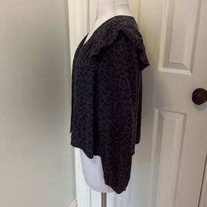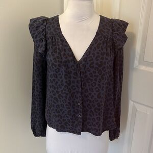 Navy /black cheetah print. Lightweight, with feminine ruffle detailing on sleeves. Button up front. Buttoned cuffs.