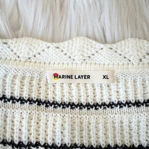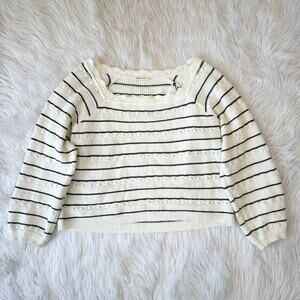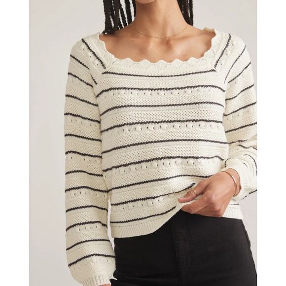 Marine Layer Sara Crochet Top Striped Square Neck Cinched Sweater, Antique White Preppy