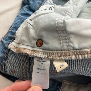 Marine Layer Sasha Floral Embroidered Denim Jean Shorts. Light wash with intentionally distressed/unfinished hem in a size 25. High waisted with a vintage fit. Sweet embroidered details on front and back. A nice detail on a classic short.