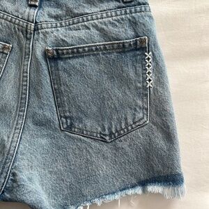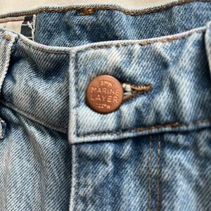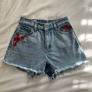 Marine Layer Sasha Floral Embroidered Denim Jean Shorts. Light wash with intentionally distressed/unfinished hem in a size 25. High waisted with a vintage fit. Sweet embroidered details on front and back. A nice detail on a classic short.