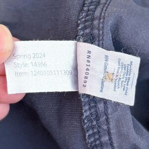 Washed navy blue relaxed chino shorts with side slash pockets and two back button pockets. Marine Layer logo on top right back pocket. Drawstring, elastic waistband closure and non-functioning fly.