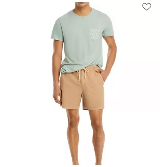 Marine Layer Saturday , pull on, tan, drawstring waist, relaxed, comfortable shorts.