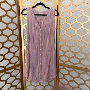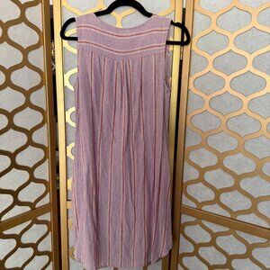 Marine Layer dress, sleeveless dress, button-down dress, medium size dress, casual summer dress, striped women's dress, cotton linen blend dress, lightweight dress, purple orange dress, pleated back dress, warm-weather outfit, women's medium clothing, breathable summer attire, boho, bohemian, resortwear, beach, beachside