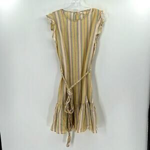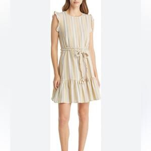 Chic mini dress with ruffle sleeves. Features a striped pattern. Includes a waist tie for a flattering fit.