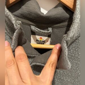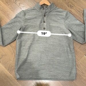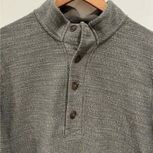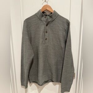 Marine Layer Clayton Pullover in gray Heather. Long sleeves, quarter button closure at the neck, stand up collar. Stadard semi-relaxed fit. 73% Cotton, 22% Polyester, 5% Rayon, medium weight and cozy, great for a business casual layer & great for after work outdoor activities as well. Gently worn, excellent condition, no holes/stains.