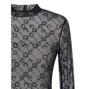 Semi-transparent mesh top with all-over flocked Moonogram, high neck, and long sleeves.