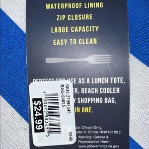 Marine Nautical Blue White Striped Large Beach Picnic Lined Cooler Tote NWT