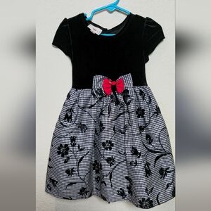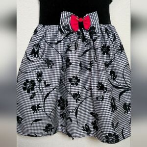 This delightful kids dress features a classic black top with a charming black and white floral skirt. Accented with a cute pink bow, it's perfect for any special occasion.