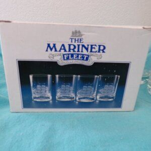 This vintage set of 4 Mariner Fleet old-fashioned glass tumblers showcases an etched sailing ship design, perfect for enjoying whiskey in a classic style. Made in Turkey, these spirit glasses add a touch of nautical charm to your drinkware collection. Comes with original box.