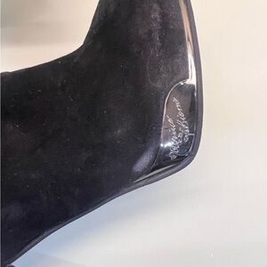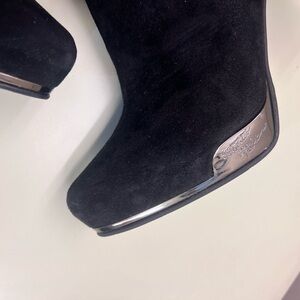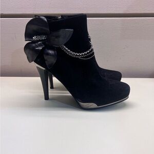 These black heeled boots feature a sleek stiletto heel and a chic satin bow on the side, adding a touch of elegance to any outfit. The boots are crafted from a suede-like material with a glossy patent leather toe, offering a stylish contrast. A delicate silver chain around the ankle enhances their sophisticated appeal.