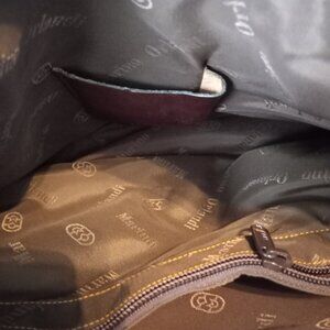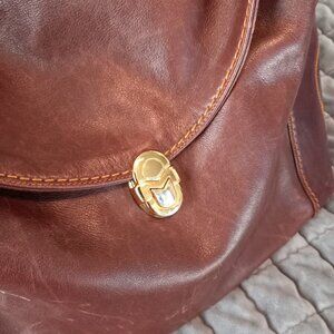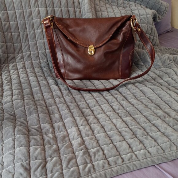 Marino Orlandi Brown Leather Shoulder bag with gold tone hardware, brand logo, 5 metal feet on bottom of purse embossed log on each end of the bag, zipper outside back pocket and another zipper pocket under flap closure.