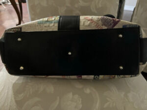 All hardware is like new with no scratches, no rips or tears anywhere on or in the bag. There are a few tiny white stains on the inside lining that are not visible from the outside which are shown in the 3rd to the last picture. The overall leather part of the purse is in excellent condition and has no holes or tears anywhere. The black leather part of the purse does have some barely visible topical minor scratches and blemishes from normal wear as shown in the last 2 pictures