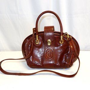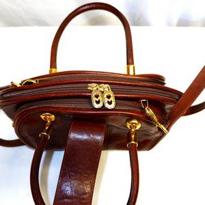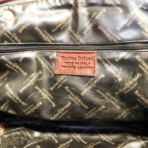 Vintage Marino Orlandi Italy Large Brown Leather Bag / Cross Body. Item is in excellent used vintage condition. The bag has a few random scuffs and marks as pictured. Excellent exterior leather patina with gold-tone hardware. Leather Lining is very clean. Bag features 3 zippered compartments, which makes it great for organizing daily items or travel items. Bag has interior zipper pocket, 5 brass feet for support. Made in Italy Measures: 14" x 8" x 5" – handle drop is 5”, detachable shoulder strap drop is 19” ". Please view all photos.