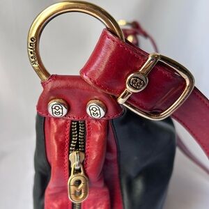 This is a Marino Orlandi Italian leather shoulder bag, showcasing a striking color block design in black and red. The bag is crafted from high-quality, genuine leather, known for its durability and luxurious feel. The gold-tone hardware, including the signature logo zipper pull and buckle, adds a touch of elegance. The bag features a spacious interior, making it perfect for everyday use. The adjustable shoulder strap allows for comfortable wear, and the unique design elements, such as the contrast stitching and distinctive shape, make this bag a true statement piece.