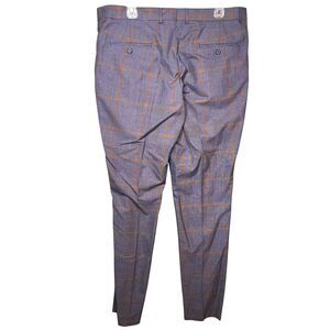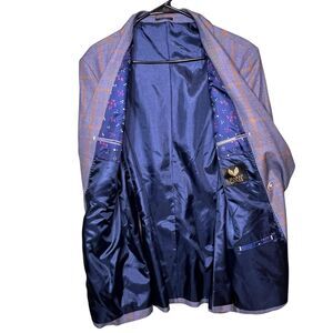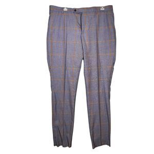 Two-piece suit includes blazer and matching pants. Blue plaid pattern with orange/tan overcheck for a modern classic look.