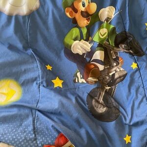 Mario Brothers Go Kart Super Nintendo Twin size. Graphic Comforter Experience the thrill of Mario Kart with this vibrant bedding set. Featuring iconic characters in a dynamic design, it's perfect for fans of all ages. Add a splash of color to your bedroom with this multicolor set. Double-sided comforter.