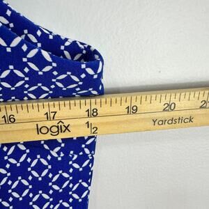 Chic and timeless sleeveless sheath dress by Mario Serrani in a vibrant cobalt blue with white geometric print. Features a tailored silhouette, concealed back zipper, and a fully lined interior. A versatile piece perfect for business, brunch, or vacation styling.