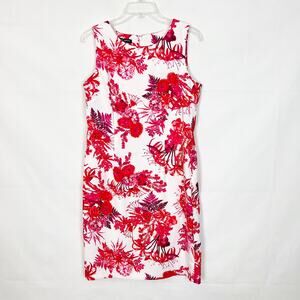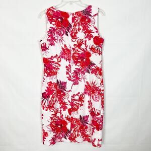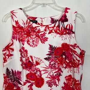 Mario Serrani women's floral dress red, pink, burgundy and white. Round neck. Sleeveless. Hidden zipper in back. Unlined. Midi or knee length depending on height. Gently used. No visible flaws.