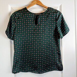 Short-sleeve top with keyhole back closure from Mario Serrani Italy in a rich green, blue and red print.