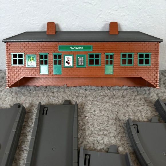 Mario train station track lot of 9 pieces, including four straight tracks, four curved tracks, and station components designed for playset builds, replacement parts, or display.