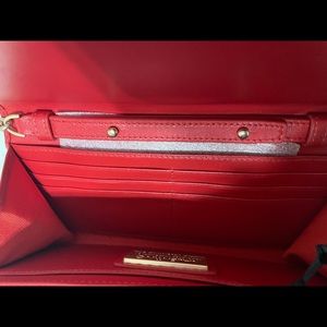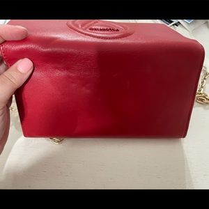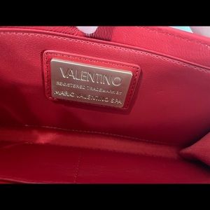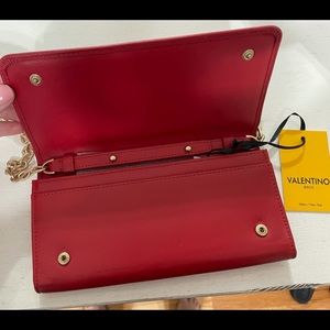 Elegant red crossbody bag. Features chain strap. Iconic Valentino logo.
