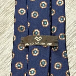This is a classic vintage Mario Valentino men’s necktie crafted from 100% Italian silk. It features a timeless navy blue base with an all-over geometric medallion pattern in teal, tan, and white tones — perfect for business, formal, or vintage styling.