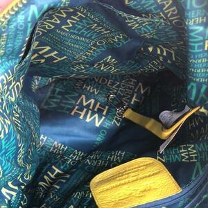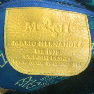 Please look at the picture of the back of this bag has color transfer from James so needs to be re-stain inside is clean. Brown adjustable strap it is 1.5 inches wide. Handmade in Columbia. Measures 11 x 12 has one large zippered pocket on the front and two small exterior pockets, inside has one large zippered, pockets, and one open pocket.