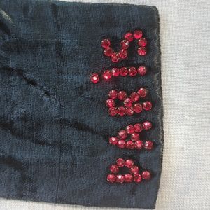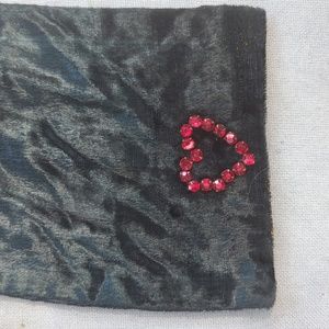Vintage super cute black velour Marion Godart scarf. Has red stones on the ends of the scarf that has a heart and says Paris. Measures 5" X 34". Super cute and unique.