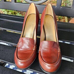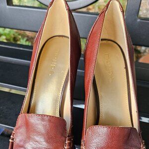 Maripe brand Madrid style block/ stacked heeled loafers. Reddish brown leather, 3 1/2 in heel - Worn once inside!
