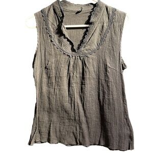 Product Description: sleeveless v-neck tunic with embroidery trim. No size tag but fits like a small.