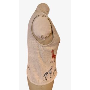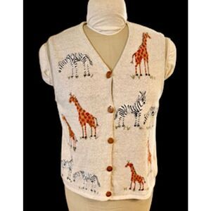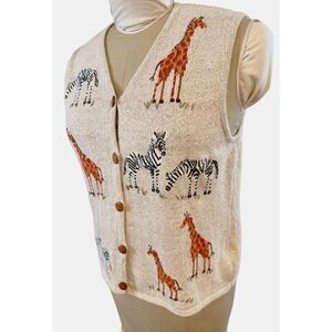Beautiful cotton/silk blend sweater vest by Marisa Christina. Button up front with v-neck. Zebras and giraffes all over! Size M. Like new! Tan.