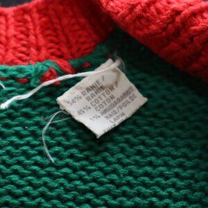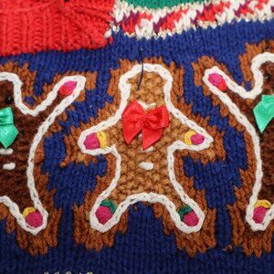 Decent condition - can be worn as/is but could use a little love too. One gingerbread man is missing his eyes, possibly a missing ornament on one tree, some loose threading on tree ornaments, and as it is 30 years old, it has a very slight Christmas past mustyness so a bath would be good too...or at least airing it out a little.