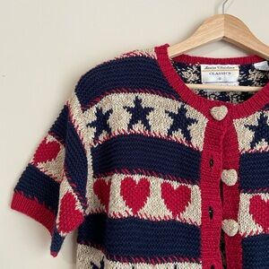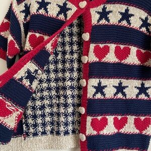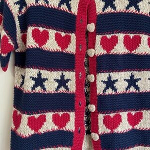 Hand-knitted cardigan top with intricate patterns. Features heart shaped cloth buttons. Patriotic, good quality, vintage