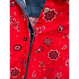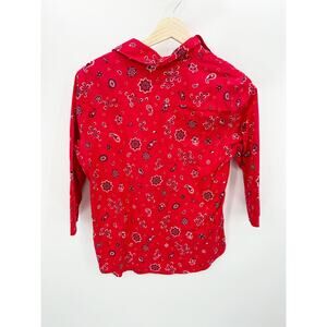Handkerchief print red button down shirt. Button front closure, collared neckline, floral and paisley print.