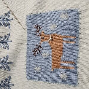 Great Condition with a couple detail stitches missing in the outline of the deer block. It is not very noticeable, see the photo pointing to the missing stitch. This does not appear to have ever been worn. The neck brand tag is unstitched on one side.