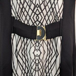 Make a statement in our shape-enhancing black and white geometric color-block short-sleeve midi dress. Stretch shift dress in a very forgiving Scuba knit fabric. Accentuates your shape with the beautiful gold hardware belt at the waist.