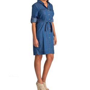 The denim shirt dress re-invented with the blue tencel denim dress, flattering mid-thigh length, cinches in waist and drapes elegantly in back; a go-to dress for a multitude of occasions.