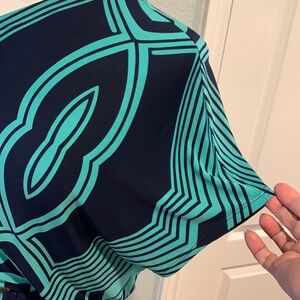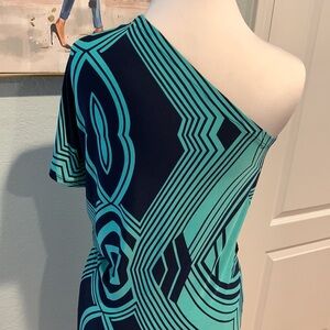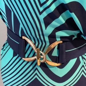 Simply stunning bodycon dress in brand new condition💋Beautiful geometric pattern, teal green and black and includes elastic belt with gold interlocking buckle! Figure flattering 💋 Measurements and fabric info in pictures!