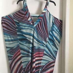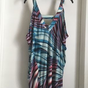 Pretty, multicolor designer dress. Soft and sleek. Very comfortable and sexy! Great with sandals or stilettos!!