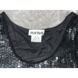 This vintage Marisol tank top is a rare find for any fashion enthusiast. The black geometric pattern is accented with sequins, beading, and embroidery, making it a unique piece that is sure to turn heads. The strappy sleeve design and scoop neckline add a touch of elegance, while the XL size and regular fit make it a comfortable option for any occasion.