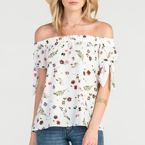 -FLOWER PRINT TOP -OFF SHOULDER -SHORT SLEEVES WITH TIE  -MADE IN USA 100% POLYESTER -LENGHT: 19" -CHEST:17"