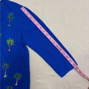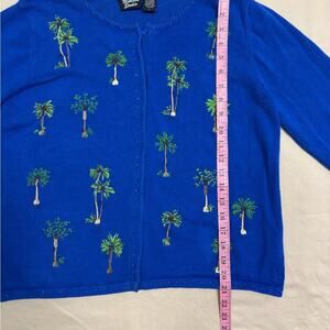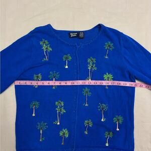 Used, excellent condition. Really cute, unique cardigan sweater. 3/4 length sleeves. Beautiful, bright blue color. Beaded palm tree design on the front and one on the back. Approximate measurements shown in photos.