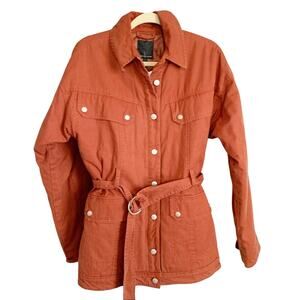 Constructed in the perfect shade of rust and fully lined with plush quilting, our Ellery Anorak is a jacket you will not take off. Designed for a slightly loose fit, tie the belt to create a cinched waist look. Finish your look with our Belle Canvas Mini Skirt for a monochrome hook-up.
