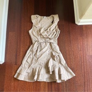 Faux wrap with attached belt, ruffles around neck and hem, non functional buttons, sleeveless, mini length, v neckline, surplice, khaki or pinky beige color, Marisa Webb designer
