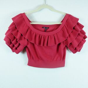 Keywords: off the shoulder top, ruffled blouse, cropped top, short sleeve top, red top, womens top, blouse, party top, summer top, knit top, Zara