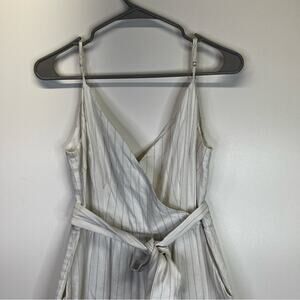 Marissa Webb Kierra Linen Blend Pinstriped Midi Dress in white. Designed with a surplice neckline and a V-back, this sleeveless dress features adjustable shoulder straps and a concealed back zipper for a seamless fit. Pinstriped throughout, it’s finished with a waist tie, side slip pockets, and an asymmetric ruffle hem that adds movement and charm to its tailored silhouette.