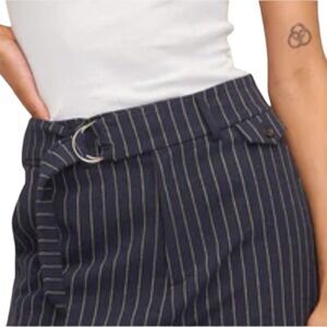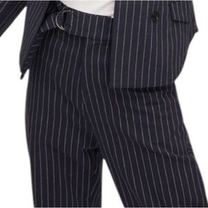 I have the matching blazer listed as well in size small. New with tag. Retail $498. The ultimate in tomboy chic, reset your style with this modern trouser. An asymmetrical, detailed front waist belt cinches for styling and fit options. Relaxed fit, adjustable tie waistband with silver D-ring hardware, balloon-shaped leg, back welt pockets, flap front coin pocket. These Marissa Webb blue pinstripe trousers exude tailored elegance with their high-waisted design and barrel cut. The classic pinstripe pattern enhances the sleek silhouette, making them ideal for professional settings. Appromately waist 14" inches across laying flat, 11 1/2" inch high waist and 30" inch inseam.